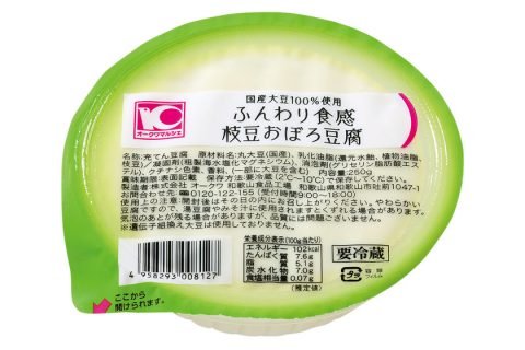 国産大豆のほのかな甘みと枝豆の風味がかおる、とろけるような食感のおとうふです。