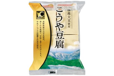 信州産大豆「ナカセンナリ」、中央アルプスの水を使用した適度な食感と滑らかな舌触りが特徴のこうや豆腐。