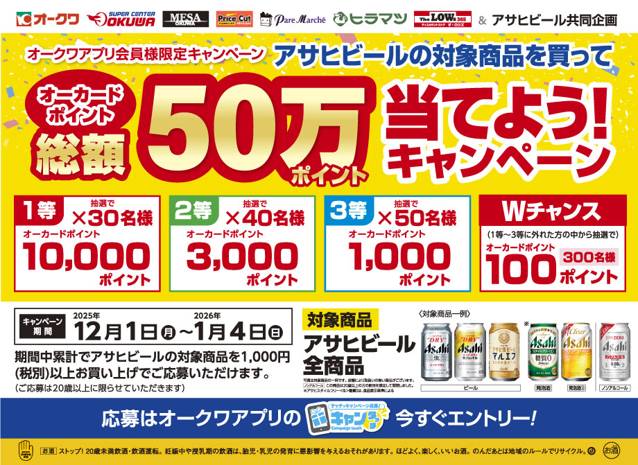 オークワアプリ限定「アサヒビールの対象商品を買って、オーカードポイント総額50万オーカードポイント当てようキャンペーン」(有効期間:2025/12/1から2026/1/4まで)