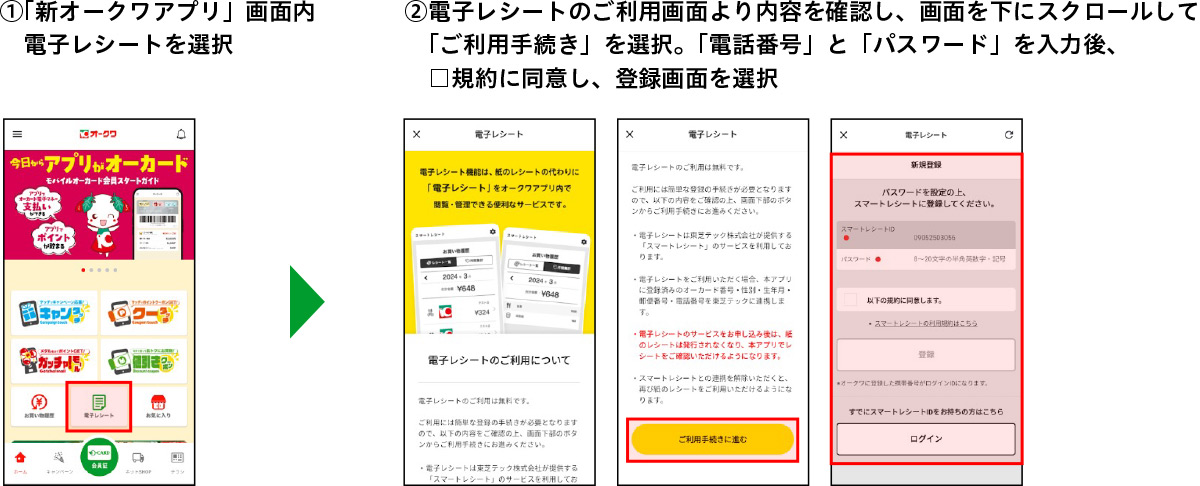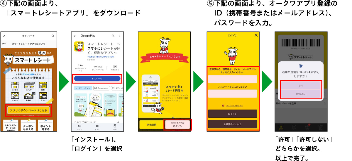 ・「オークワアプリ」→「電子レシート」→「メニュー」→「もっと便利に、もっとおトクに!(詳細はこちら)」→アプリをダウンロード。