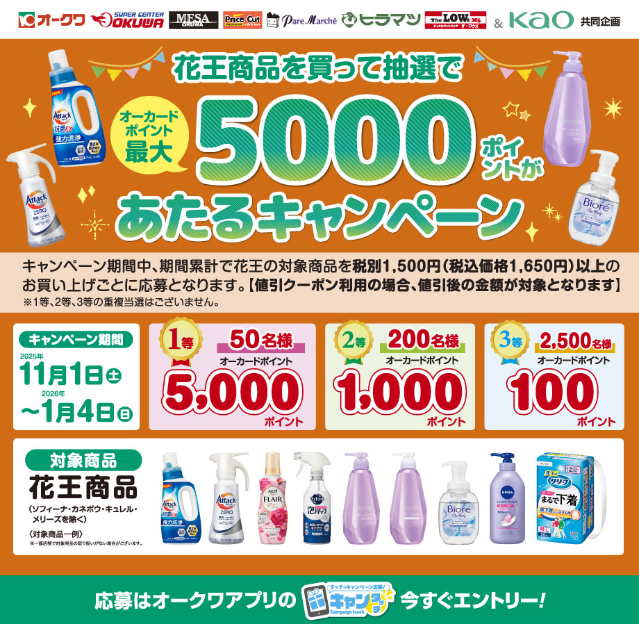 オークワアプリ限定「花王商品を買って、抽選でオーカードポイント最大5,000ポイントがあたる!」キャンペーン(有効期間:2025/11/1から2026/1/4まで)