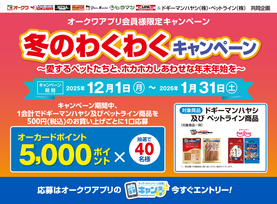 オークワアプリ限定「ドギーマンハヤシ・ペットライン 冬のわくわくキャンペーン」