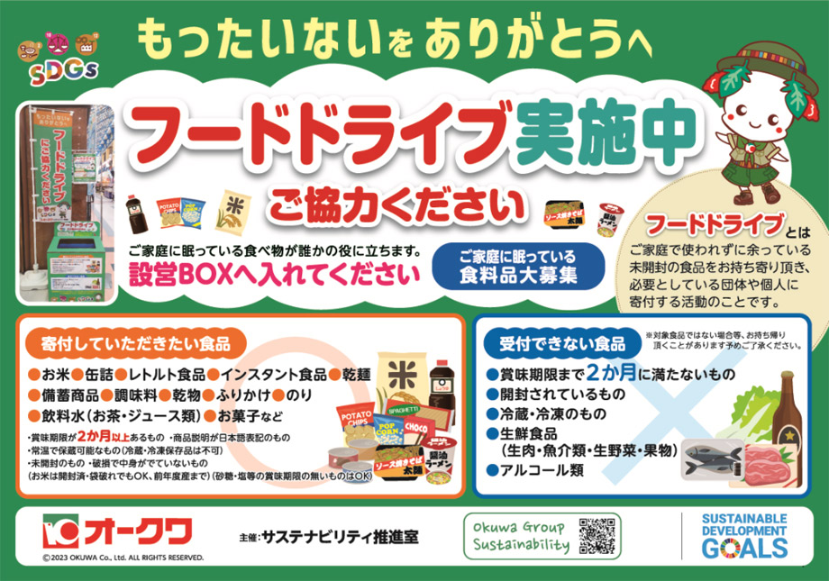 ご家庭で使われずに余っている未開封の食料品を皆様からお持ち寄り頂き、子ども食堂や支援を必要としている方々に寄付する『フードドライブ』活動を社会福祉協議会様やNPO法人様と協業し、2024年6月より和歌山県・奈良県・大阪府のオークワの店舗で行っています。
