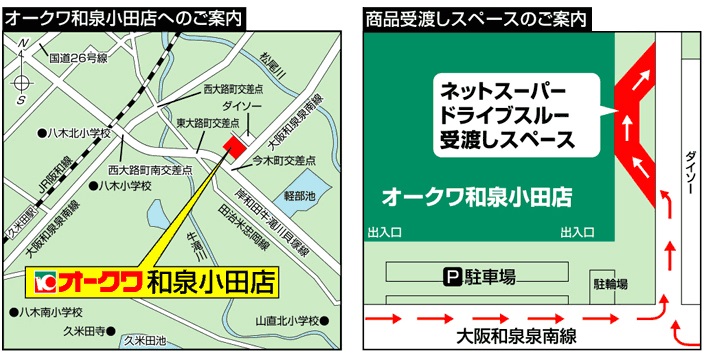 ネットスーパーオークワ和泉小田店では、ご注文商品を地域限定でご指定の住所までお届けする「配達注文」もしくはネットスーパードライブスルー専用の商品受渡しスペースでお受け取りいただく「店舗受取注文」を承っております。