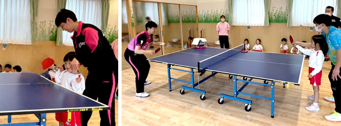 日本卓球リーグ実業団連盟の社会貢献活動の(福祉施設、小学校、幼稚園、保育園を対象に)一環として、 『第2回普及セミナー』が大阪府のゆり保育園にて開催されました。 ※第1回は2023年愛媛県の幼稚園で開催。 園児たちに卓球の楽しさを知ってもらうために、基本的なフォア・バック・ドライブ・カットの手本を見せ、 また、ラケットを一緒に持って打ち方の指導や実際に補助をせずにラリーをしたりしました。 自分で打って相手コートに入った時やラリーが続いた時は園児たちは喜んでいて、 セミナーが終わった後は、『楽しかった!』という声が多くありました。 子どもたちに卓球の面白さを知ってもらい、今後卓球をして少しでも卓球人口が増えて行けばいいなと思います。 |